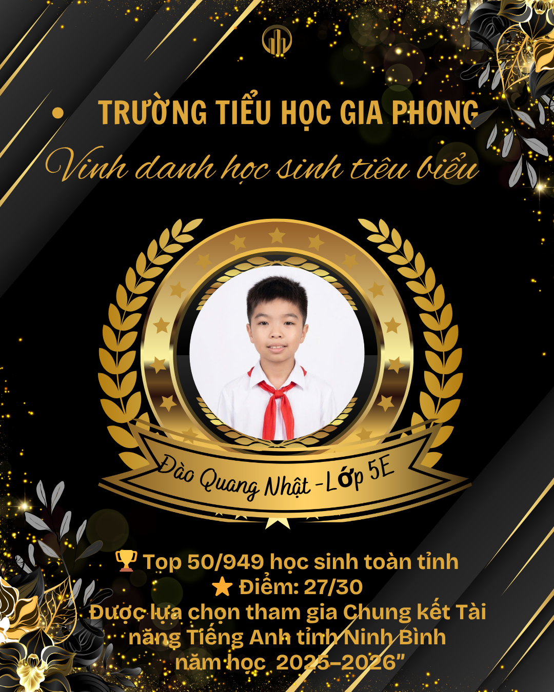 Căn cứ thông báo kết quả Vòng Sơ khảo Hội thi “Tài năng tiếng Anh tiểu học” năm học 2025–2026 của Sở Giáo dục và Đào tạo tỉnh Ninh Bình, Trường Tiểu học Gia Phong vui mừng thông tin và vinh danh em Đào Quang Nhật – học sinh lớp 5E đã đạt thành tích xuất sắc trong kỳ thi.
